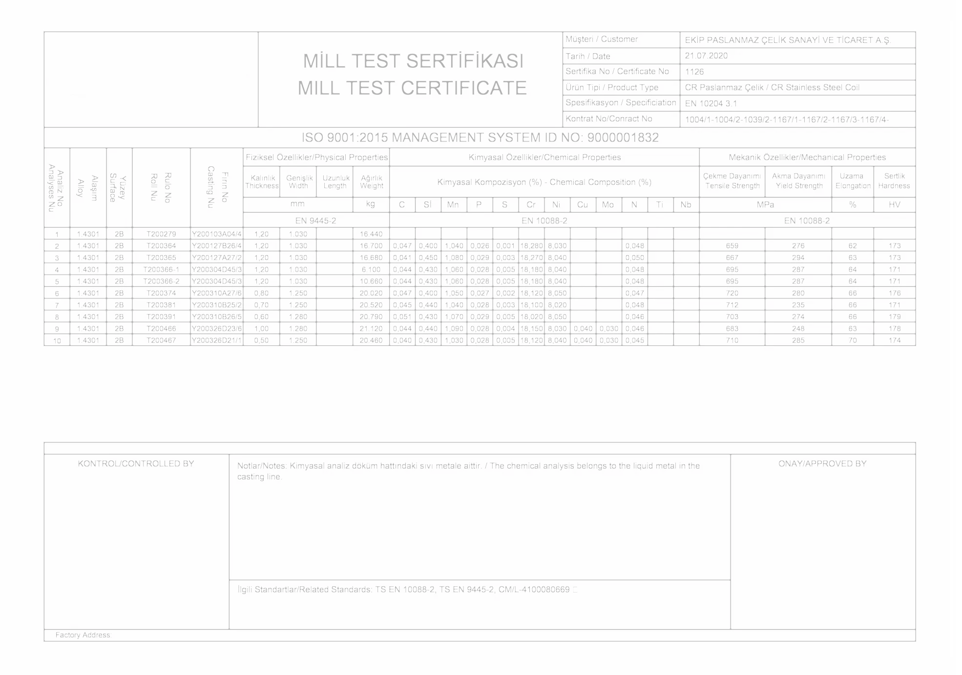 İlk bölüm sipariş numarası, coil numarası, tedarikçi ve müşteri firma isimleri, sertifika numarası ve oluşturma tarihi gibi bilgilerin olduğu bölümdür. Sertifikanın baz aldığı standartları burada belirten firmalarda bulunmaktadır.