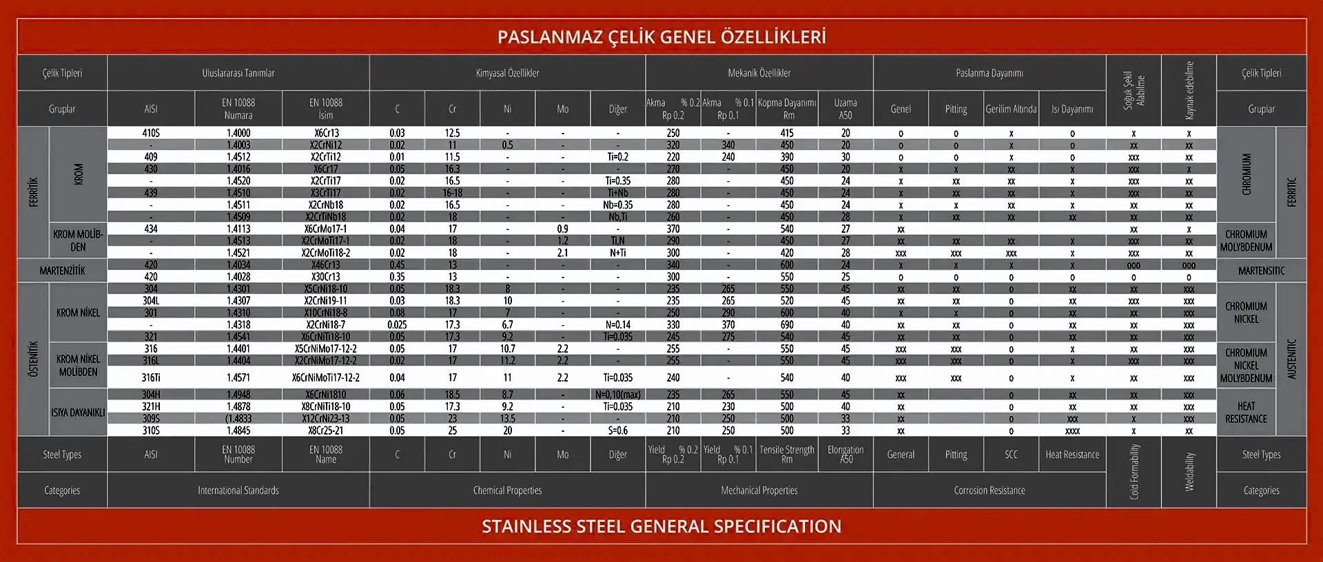 Östenitik grubunda 0,30mm den 14mm kalınlığa Feritik grubunda ise 0,30mm den 10mm kalınlığa kadar plakalarımız mevcuttur. Müşterilerimizin özel taleplerinde ise 150mm enden 2000mm ene kadar ve 500mm boydan 12000mm boya kadar plaka işlemi yapılmaktadır.